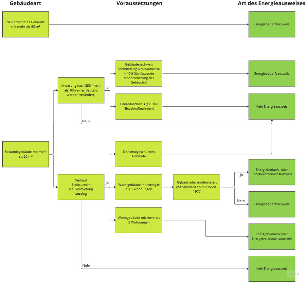 Folgende Grafik zeigt, wann welche Art von Energieausweis ausgestellt werden muss: